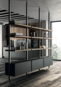 Il porta accessori sul piano di lavoro completa il gioco di contrasti fra materiali chiari e scuri e fra pieni e vuoti