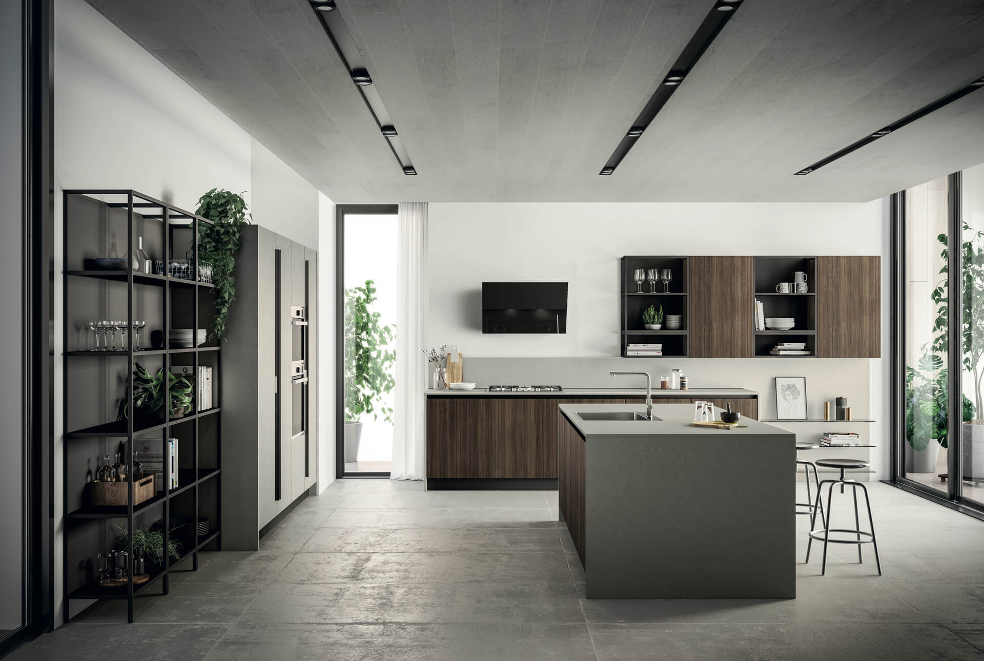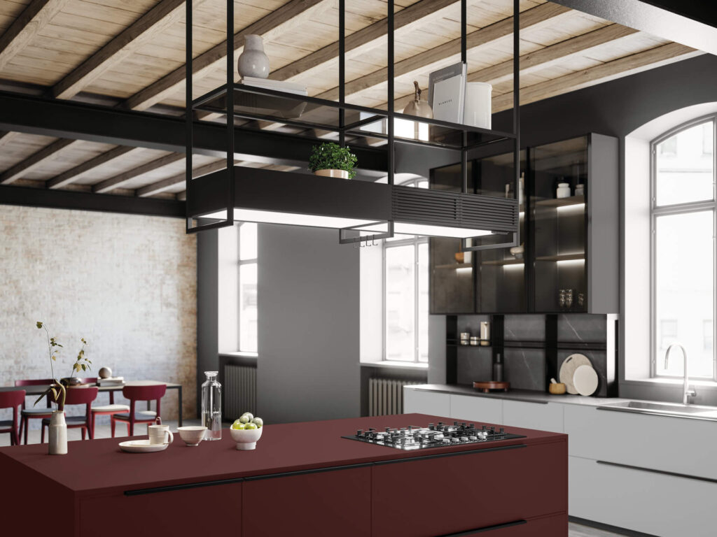 In questo ambiente, la cappa è integrata al piano cottura: per risparmiare spazio in altezza e evitare la dispersione e risalita di fumi e vapori.